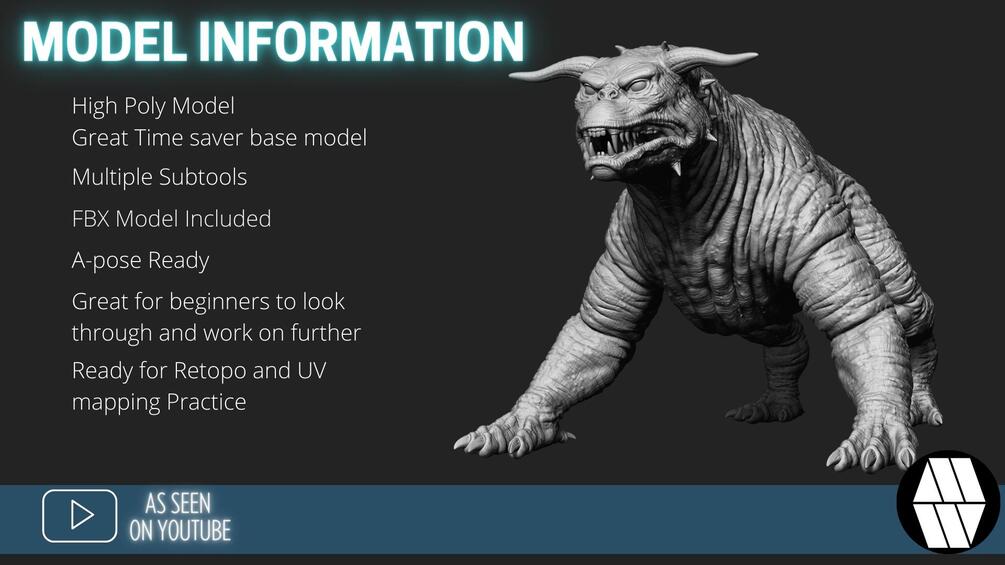 An excellent model to use for Practicing and referring back to. Take this base model further with detailing inside of ZBrush or use the FBX model in Blender or other 3D softwares.