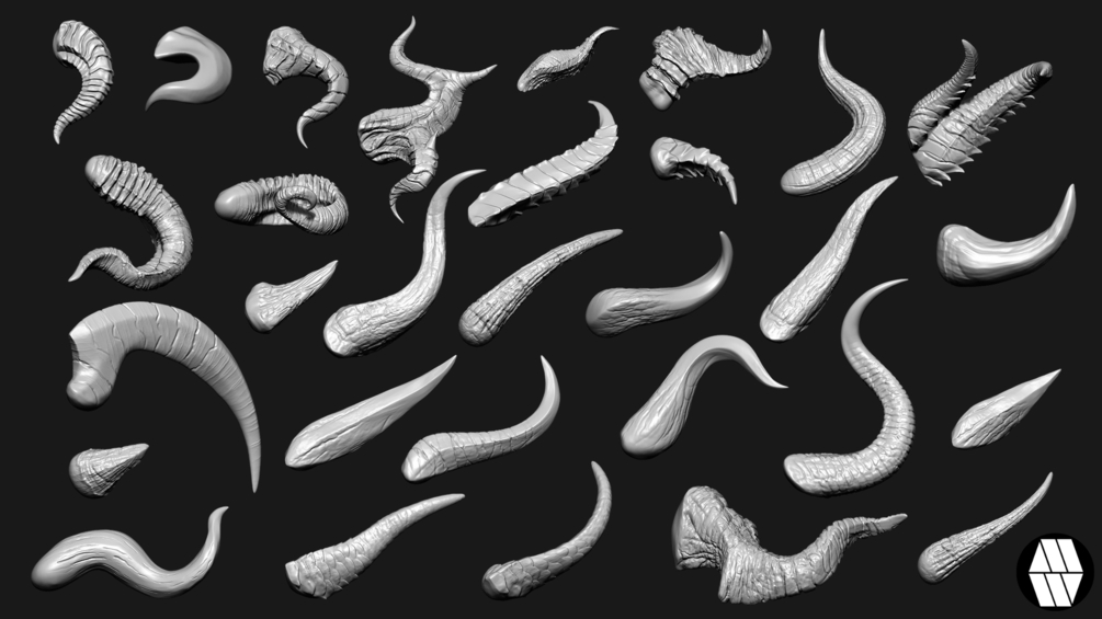 30 Custom made Horn IMM models to use in ZBrush to create base details on your models and speed up the modelling process, which can then be further refined and polished by hand.Β