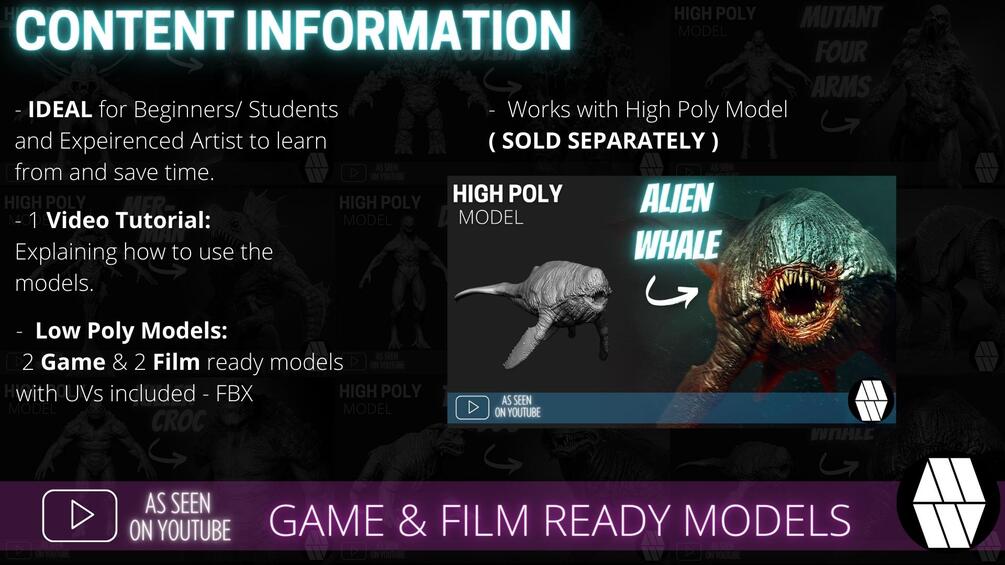 Great time saver for students learning how to Texture/ Rig and Animate without the need to retopolo high poly models. Also a great source of reference for artist who are learning to retopo and UV map.