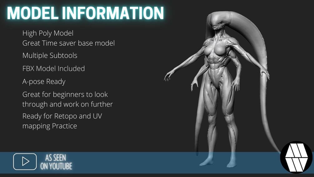 An excellent model to use for Practicing and referring back to. Take this base model further with detailing inside of ZBrush or use the FBX model in Blender or other 3D softwares.